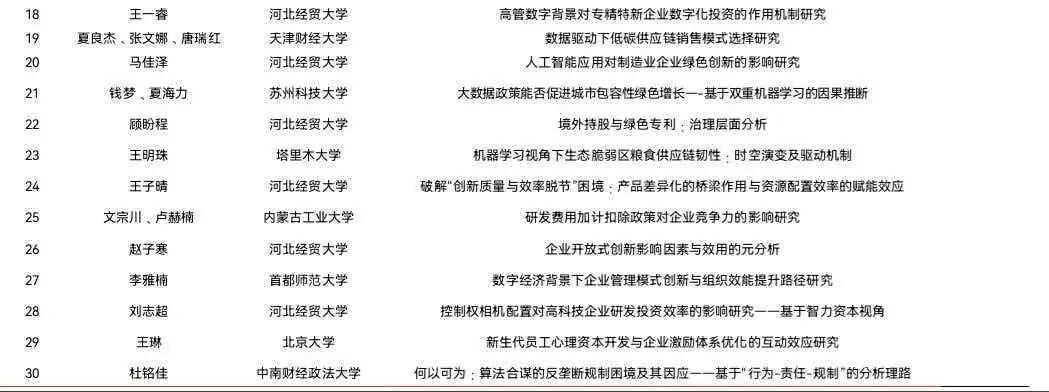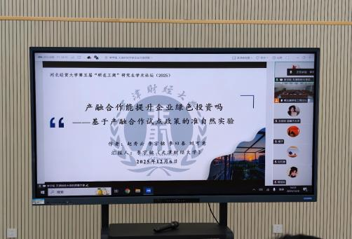 本次论坛自发布公告起,共收到来自北京大学、南开大学、国防科技大学、中国政法大学、中南财经政法大学、首都师范大学、天津财经大学、西南科技大学等29所高校的共计53篇投稿。经专家评审和专业评审团队讨论,确定论坛入选论文30篇。设置了“人工智能与数字经济”“绿色创新与可持续发展”“创新驱动与公司治理”三个主题分论坛。来自多所高校的学者与参会代表,围绕分论坛主题进行了论文研讨与交流。九位点评专家对以上同学的论文进行针对性点评,提出专业性指导意见。最终,结合评审专家意见和点评专家意见,评选出论坛一、二、三等奖获奖论文(详见河北经贸大学第五届“研在工商”研究生学术论坛(2025)获奖论文)。