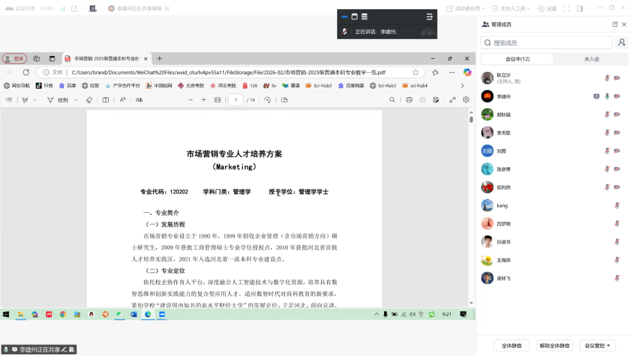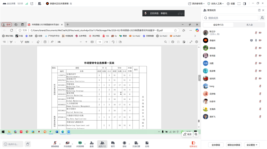 结合调研工作要求,李建州梳理了培养方案修订的核心方向与重点调整内容:一是完善专业建设脉络,将 2025 年设立的 “短视频运营与制作” 微专业纳入专业发展历程,贴合数智化人才培养趋势;二是精准对接新财经人才培养要求,在专业定位、培养目标、毕业要求等核心模块中强化应用性与数智化导向,契合国家及地方产业发展对营销人才的新需求;三是优化课程体系结构,在保持专业核心课稳定性的基础上,完善选修课体系,鼓励员工开发新媒体运营、数字营销等数智化、应用型新课,实现课程内容与行业实际的深度衔接;四是聚焦实践能力培养,结合调研工作中企业对人才实操能力的需求,谋划提升实践学分占比,强化课程实操性设计。