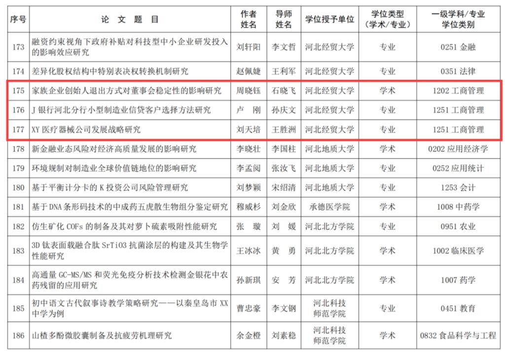 必赢565net官网2022届毕业生周晓钰(导师:石晓飞)的学位论文《家族企业创始人退出方式对董事会稳定性的影响研究》;卢刚(导师:孙庆文)的学位论文《J银行河北分行小型制造业信贷客户选择方法研究》;刘天培(导师:王胜洲)的学位论文《XY医疗器械公司发展战略研究》分别荣获2021-2022学年度河北省优秀硕士学位论文。
