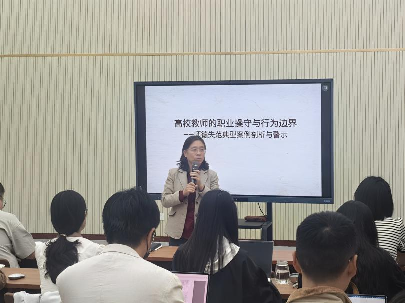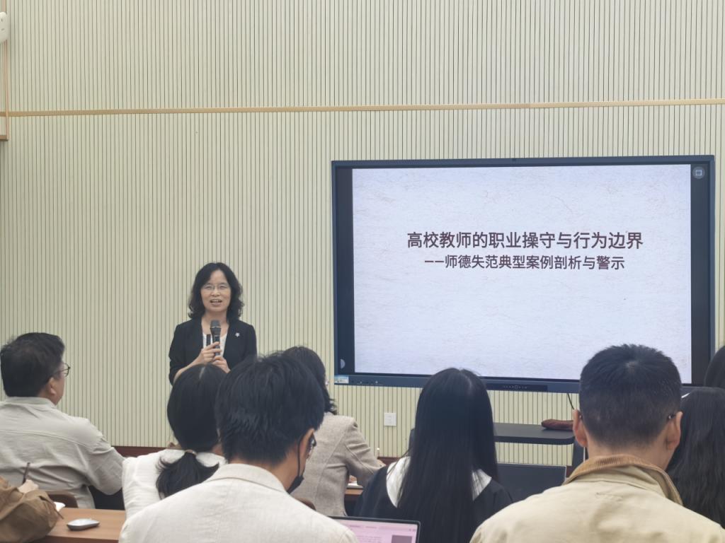 田教授围绕高校员工的职业使命与操守要求,从学术诚信、师生关系、公共言论、职业行为等多个维度深入分析了近年来高校中发生的师德失范典型案例,以此强化员工底线思维,明晰教学科研中的行为准则。她指出,高校员工不仅是知识的传播者,更是员工品格养成的重要引导者,必须时刻以《新时代高校员工职业行为十项准则》为镜,坚守职业底线,明确行为边界。随后,田韶华教授结合实际案例就日常教学科研中如何防范师德风险、处理师生关系等问题进行了阐述,她强调,员工应自觉接受监督,强化责任意识,严格以高校员工“五维道德准则”,即坚守为人品德、恪守业务道德、践行育人道德、严守学术道德、遵守公共道德自我约束,切实做到以德立身、以德立学、以德施教。