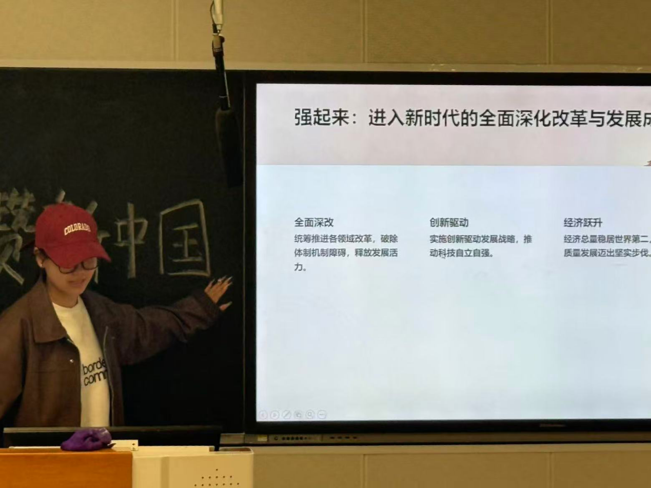活动伊始,王泓茹带领大家回顾新中国波澜壮阔的辉煌历程,系统讲解新时代在经济、科技、文化等领域的重大发展成就,有效增强了同学们的民族自信心与自豪感,帮助大家更清晰地认知青年应肩负的时代责任。随后,同学们围绕“如何践行爱国情怀”“怎样将个人理想融入国家发展大局”等核心问题展开热烈讨论,积极分享自身参与社会服务的经历与感悟,并在交流中凝聚共识、明确前进方向。