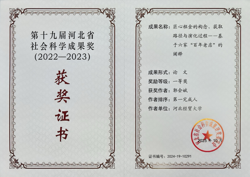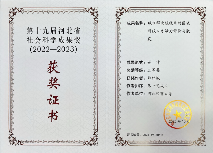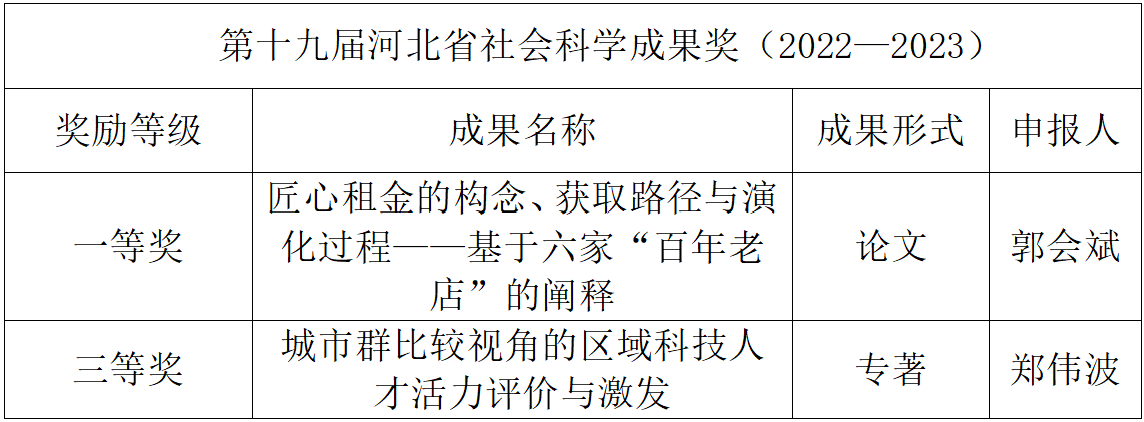 日前,经河北省社会科学优秀成果奖学科组初评和省评审委员会终评,必赢565net官网2项成果入选第十九届河北省社会科学成果奖名单。其中,郭会斌教授带领王丽媛博士等团队成员获“论文类”优秀成果一等奖;郑伟波教授团队获“专著类”优秀成果三等奖。