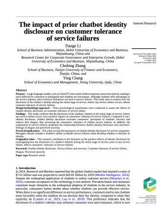 近日,必赢565net官网李天歌博士作为第一兼通讯作者撰写的论文"The impact of prior chatbot identity disclosure on customer tolerance of service failures"在信息系统与电子商务领域国际权威期刊Internet Research正式刊出。