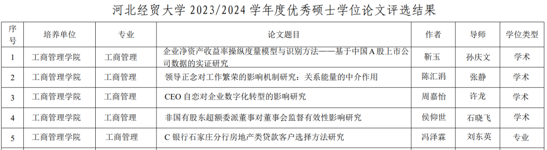 必赢565net官网2024届毕业生靳玉(导师:孙庆文)的学位论文《企业净资产收益率操纵度量模型与识别方法—基于中国A股上市公司数据的实证研究》;周嘉怡(导师:许龙)的学位论文《CEO自恋对企业数字化转型的影响研究》;陈汇娟(导师:张静)的学位论文《领导正念对工作繁荣的影响机制研究:关系能量的中介作用》;侯仰世(导师:石晓飞)的学位论文《非国有股东超额委派董事对董事会监督有效性影响研究》;冯泽霖(导师:刘东英)的学位论文《C银行石家庄分行房地产类贷款客户选择方法研究》分别荣获2023/2024学年度校级优秀硕士学位论文并全部推荐参加省级优秀硕士学位论文评选。