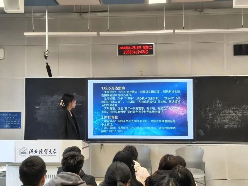 为深入贯彻新时代青年工作要求,激发青年投身科创的责任担当,筑牢当代青年科创思想根基,为科创贡献青春力量,11月18日,2025级工商管理专业一班开展“青春建功新时代,争当科创主力军”主题团日活动。本次团日活动由团支书孟宜静主持,2025级工商管理专业一班全体同学参加。