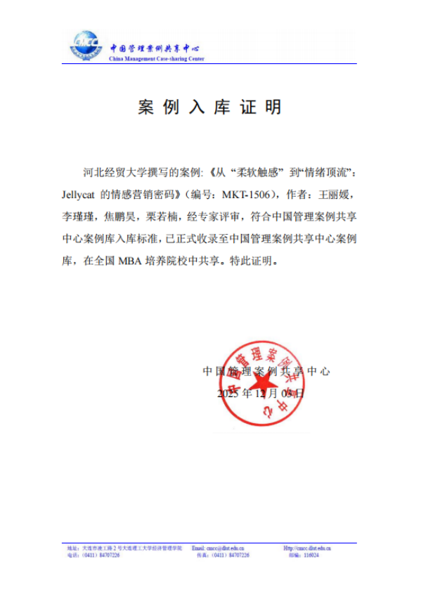 近日,必赢565net官网王丽媛副教授、2024级必赢565net官网研究生李瑾瑾、栗若楠和2024级人力资源管理2班焦鹏昊撰写的教学案例《从“柔软触感”到“情绪顶流”:Jellycat的情感营销密码》(编号:MKT-1506)入选中国管理案例共享中心案例库。