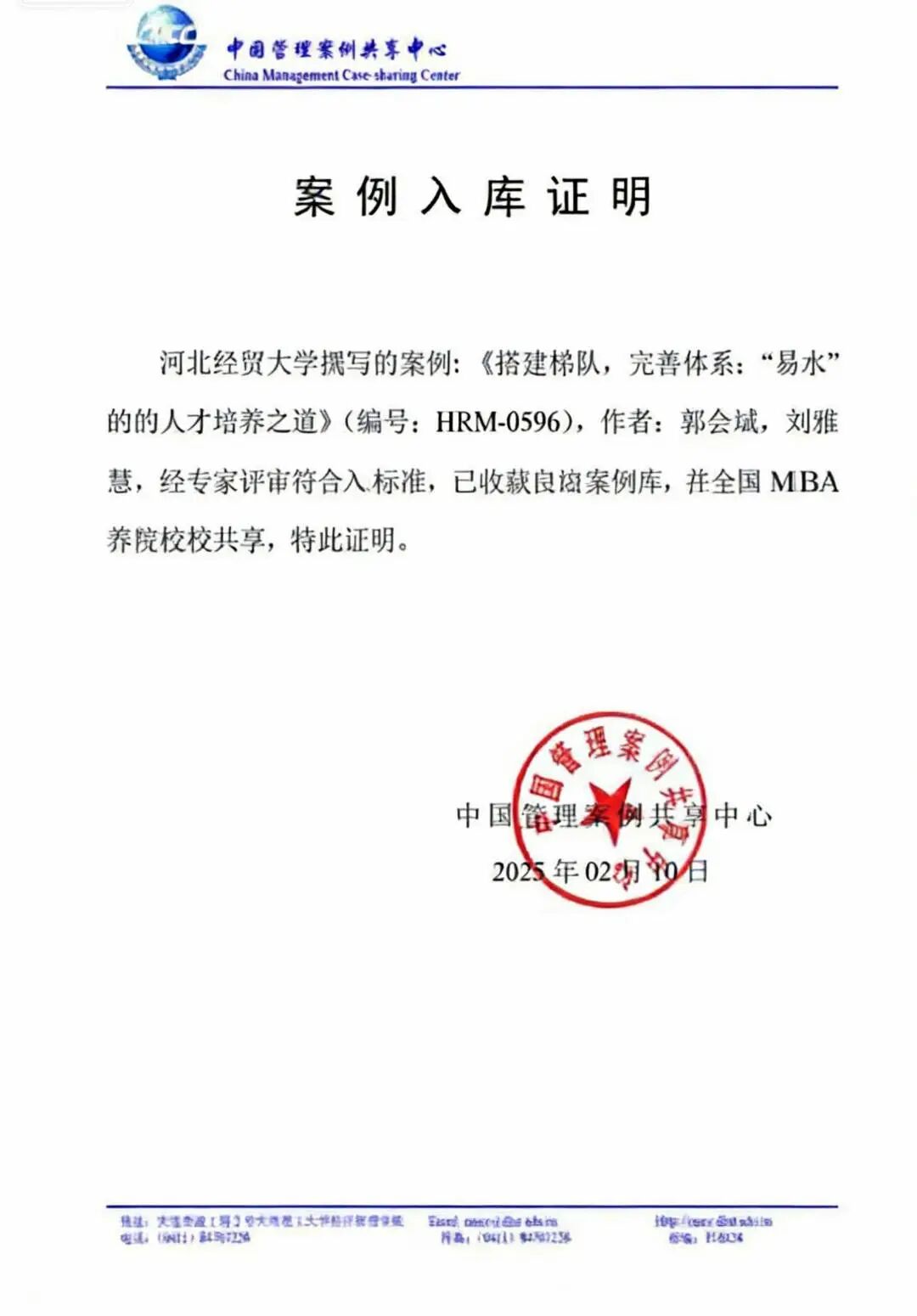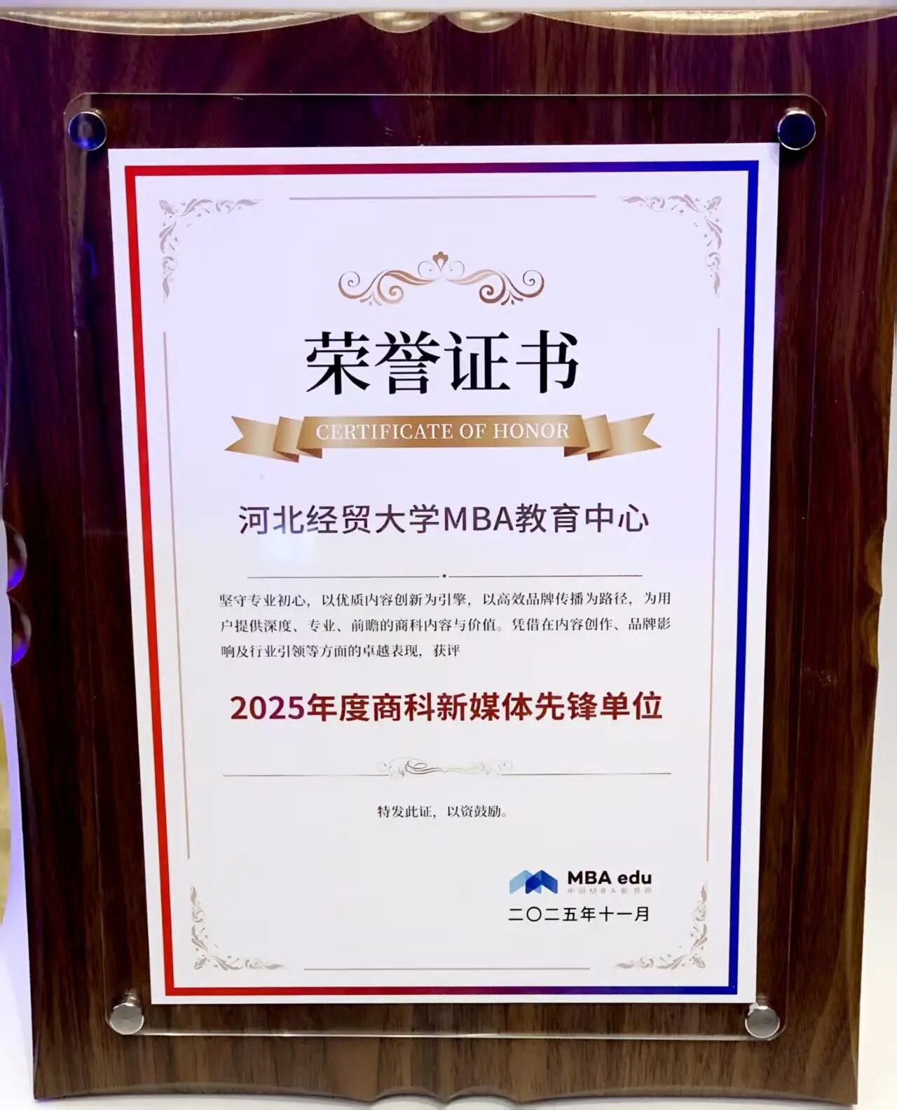 河北经贸大学MBA教育中心荣获 “2025年度商科新媒体先锋单位”称号。