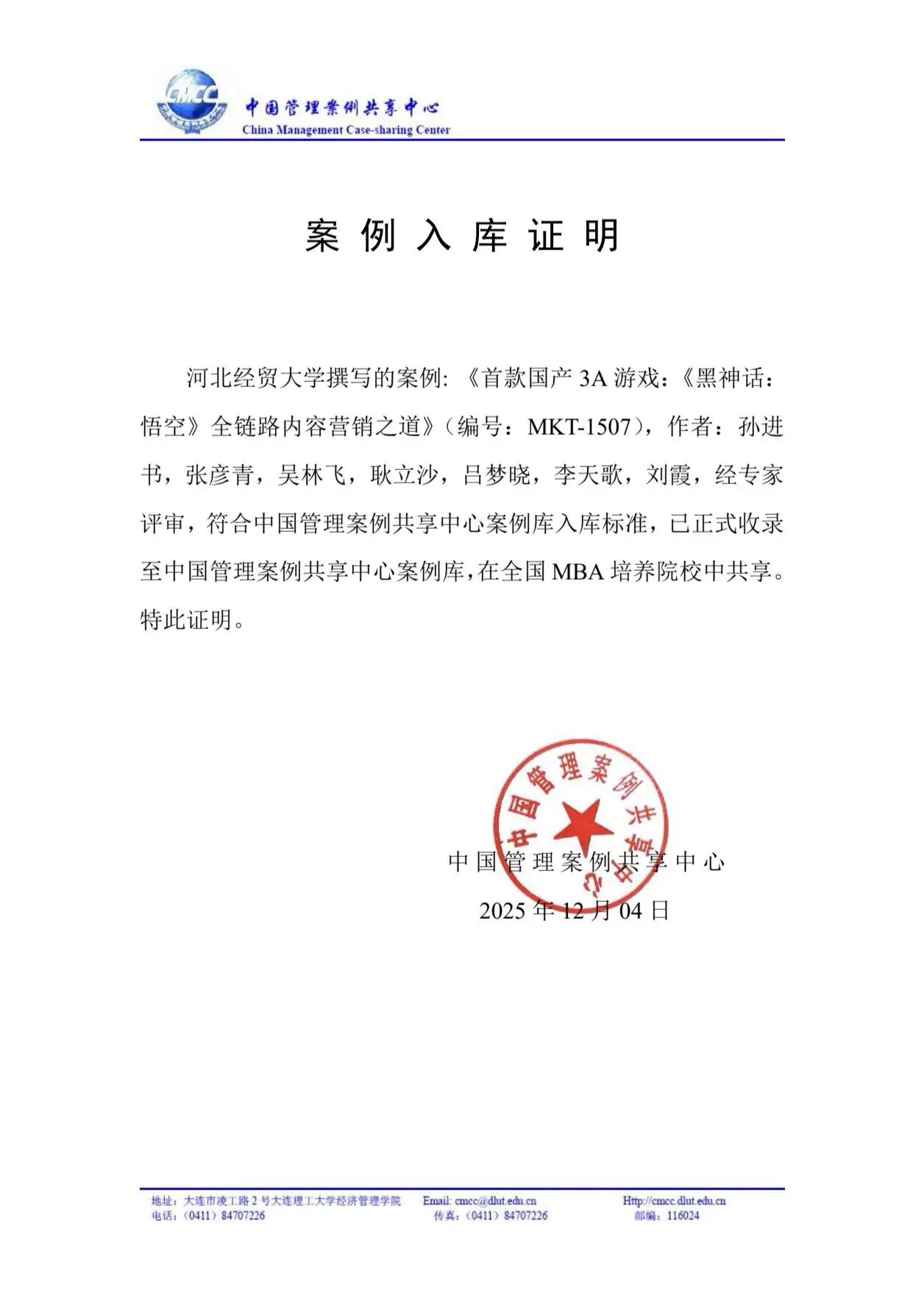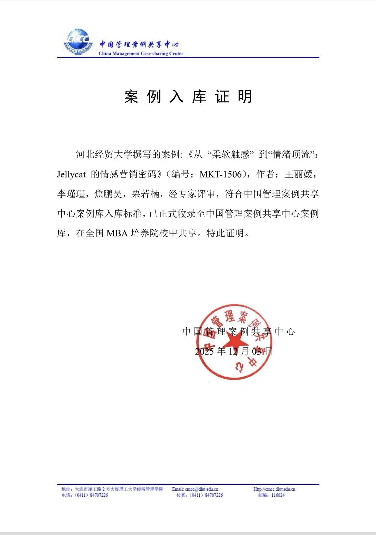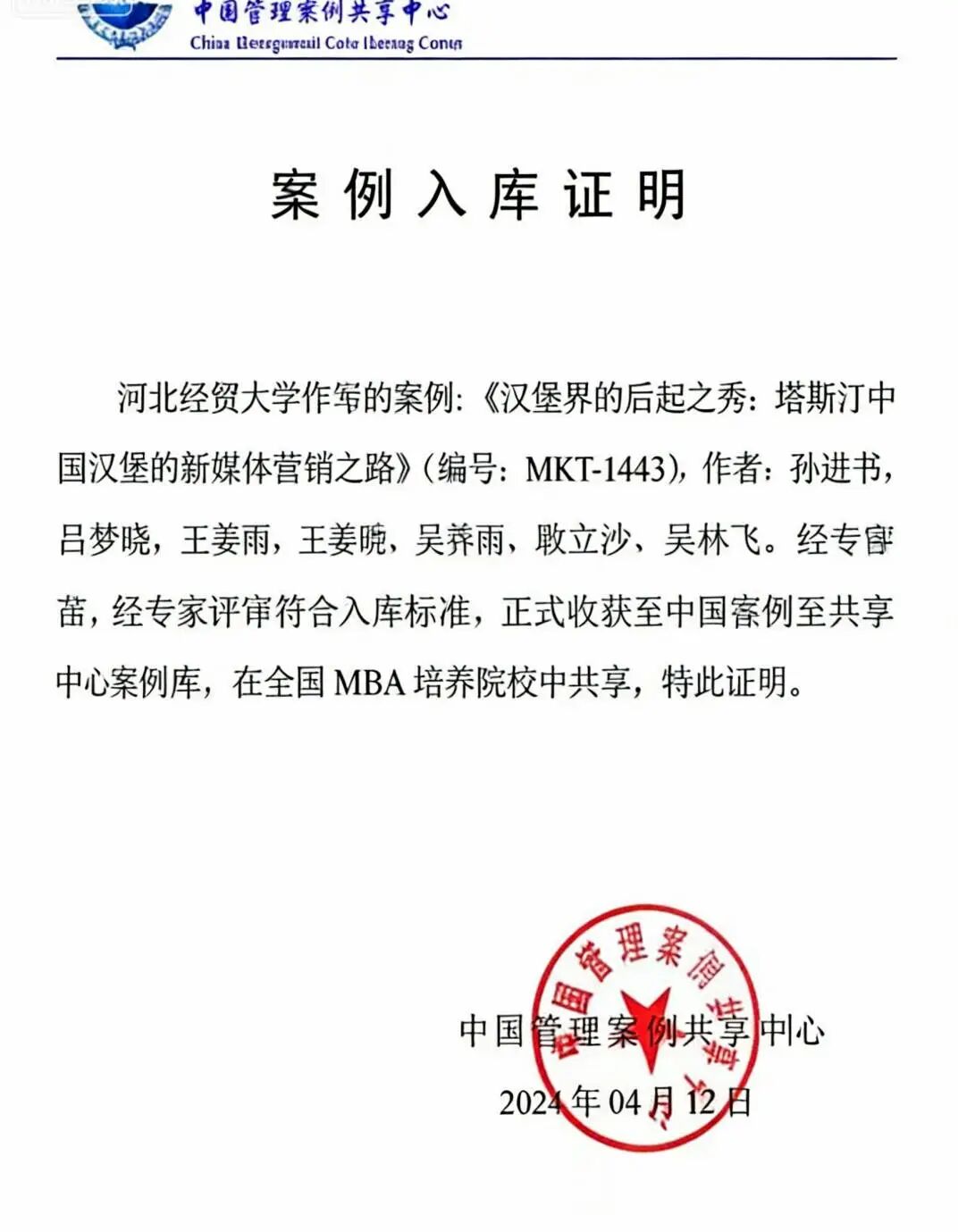 孙进书博士、吕梦晓博士、2021级智慧工商管理1班王姜雨、副教授耿立沙博士、讲师吴林飞博士共同撰写的教学案例《汉堡界的后起之秀:塔斯汀中国汉堡的新媒体营销之路》(编号:MKT-1443)入选中国管理案例共享中心案例库。