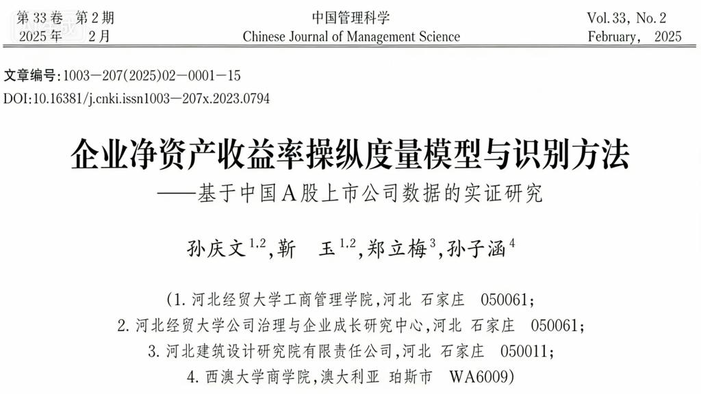 孙庆文教授和研究生靳玉的研究成果《企业净资产收益率操纵度量模型与识别方法——基于中国A股上市公司数据的实证研究》在管理学重要期刊《中国管理科学》发表。