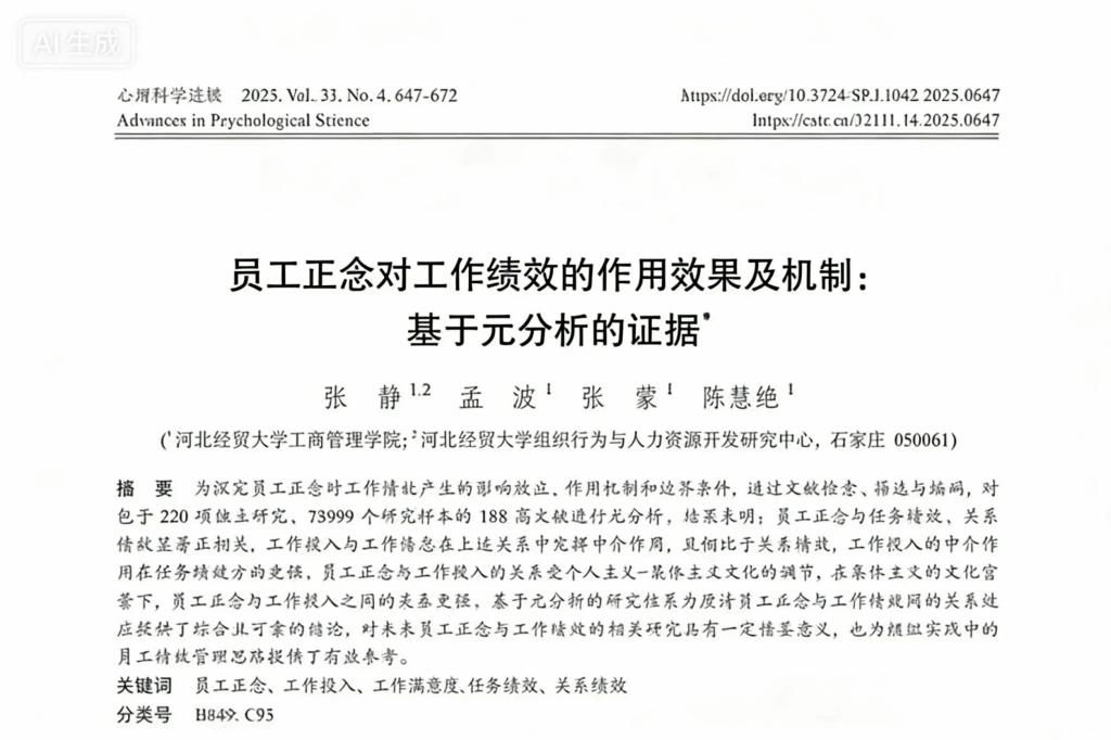 张静副教授、张蒙博士和研究生孟煜、陈慧雅的研究成果《员工正念对工作绩效的作用效果及机制:基于元分析的证据》在《心理科学进展》期刊2025年第4期发表。