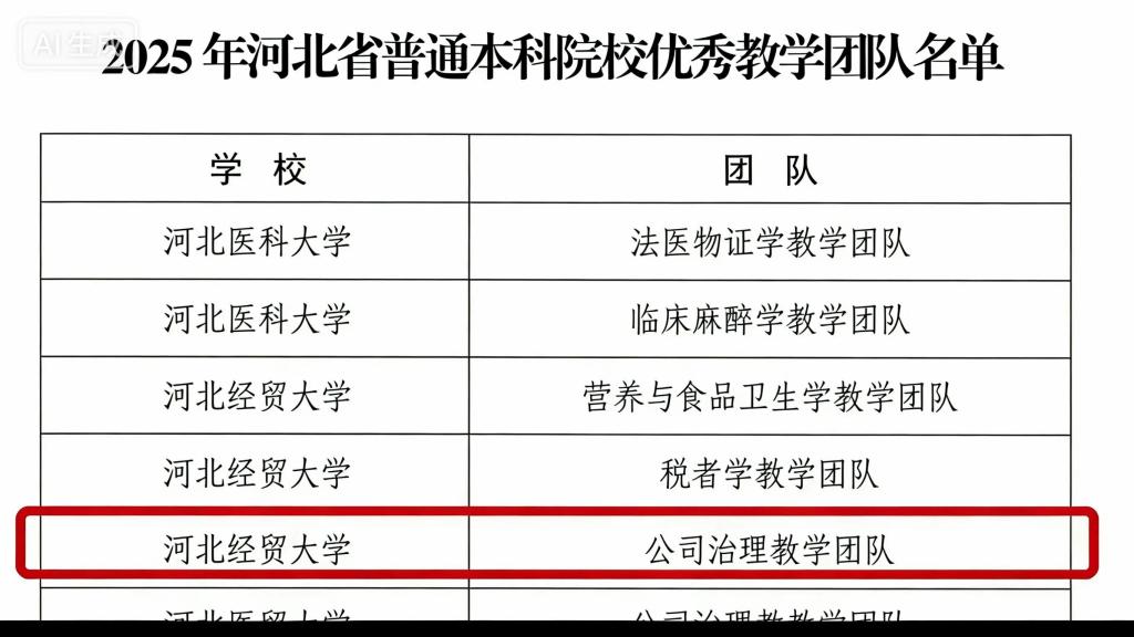 公司治理课程教学团队荣获2025年河北省普通本科院校优秀教学团队。