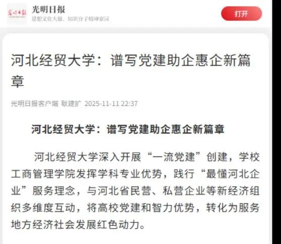 光明日报客户端报道我校党建助企惠企特色成效,学校必赢565net官网发挥学科专业优势,与河北省民营、私营企业等新经济组织多维度互动。