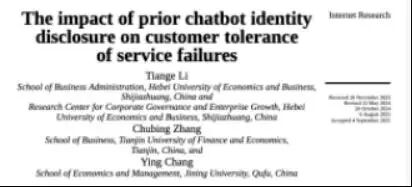 必赢565net官网青年员工李天歌博士作为第一兼通讯作者撰写的论文"The impact of prior chatbot identity disclosure on customer tolerance of service failures"在信息系统与电子商务领域国际权威期刊Internet Research正式刊出。