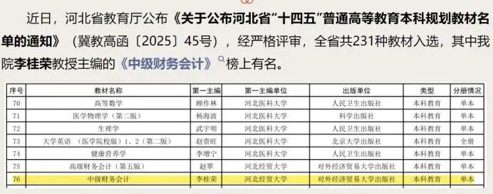 李桂荣教授主编的《中级财务会计》入选河北省“十四五”普通高等教育本科规划教材。