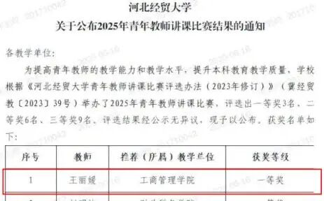 王丽媛副教授在河北经贸大学青年员工讲课比赛中荣获一等奖。