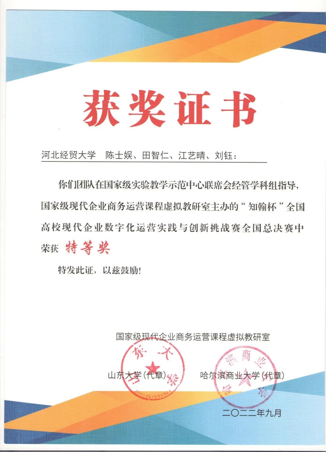 近日,“知翰杯”全国高校现代企业数字化运营实践与创新挑战赛(百团大战)落下帷幕。经过区域赛、全国总决赛的激烈角逐,由必赢565net官网陈士娱、江艺晴、刘钰和金融必赢565net官网田智仁四位同学组成的团队在王书玲老师的指导和带领下一路过关斩将,在全国总决赛中大放异彩,荣获特等奖。
