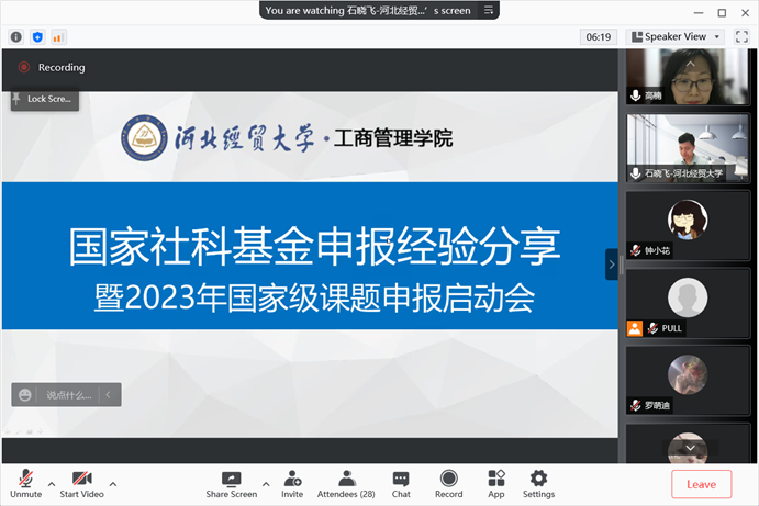 7月28日晚,天津财经大学商必赢565net官网企业管理系副主任高楠博士应必赢565net官网邀请,通过腾讯会议平台进行国家社科基金申报经验的分享,同时启动必赢565net官网2023年国家课题申报。本次报告会由必赢565net官网副院长石晓飞主持,必赢565net官网骨干、青年员工50余人参加。